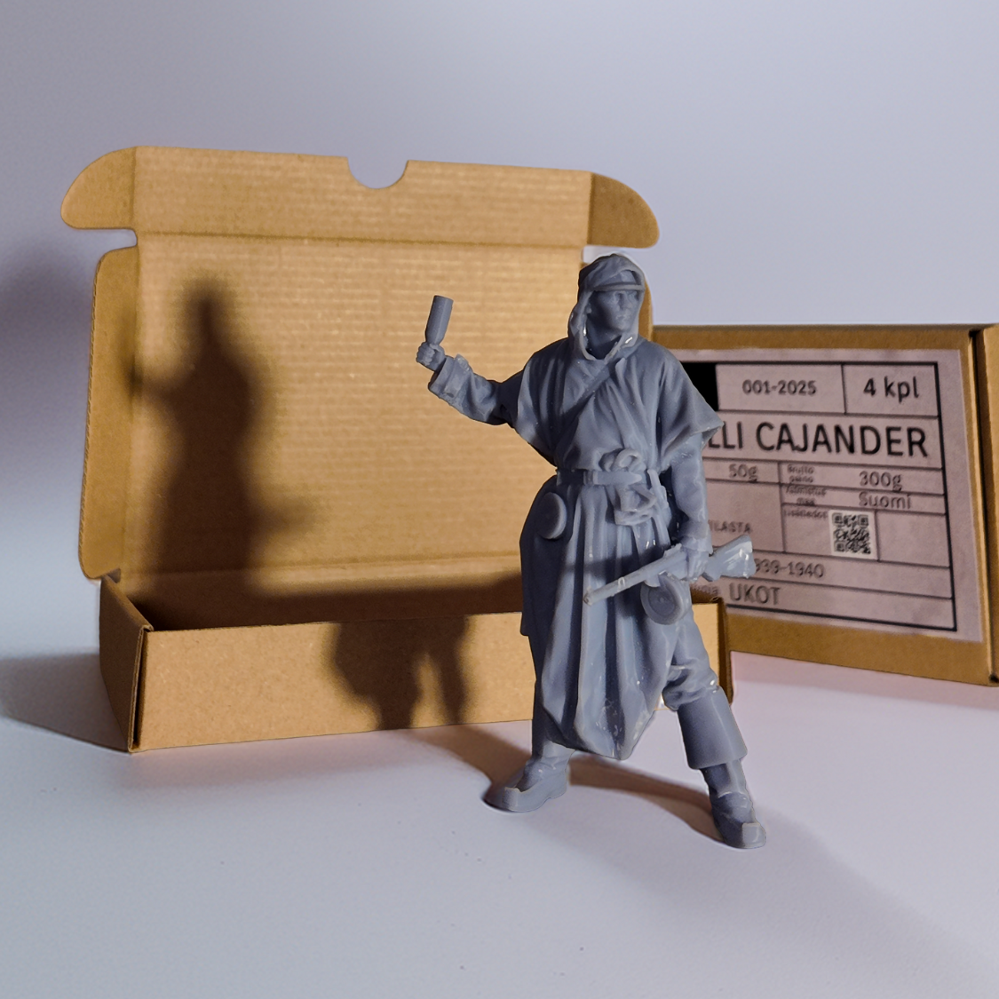 This 1/16 scale figure represents a Finnish soldier during the Winter War of 1939–1940, captured in a dynamic pose mid-throw with a Molotov cocktail in hand. Wearing an improvised snow camouflage cloak and carrying a Suomi submachine gun, the figure reflects the unique blend of improvisation and determination that defined the Finnish defense.